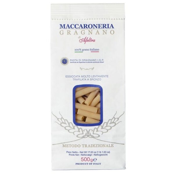 Los MACCHERONI Afeltra, elaborados con sémola de trigo cuidadosamente seleccionada de trigo 100% italiano, se mezclan con agua de las montañas Lattari, laborados en bronce y se secan lentamente durante hasta 48 horas.